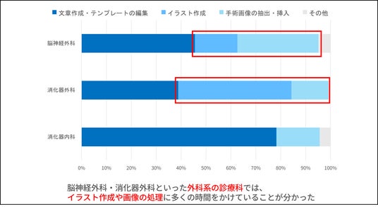- 特に文章作成やイラスト作成、画像処理などの作業に時間をかけている外科系の診療科では、手術記録作成に比較的多くの時間を費やしていることが分かった。