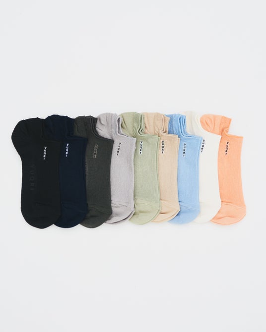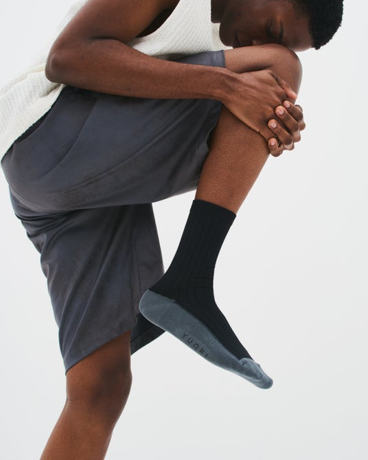 先から踵への底面に吸着性を持つ特殊な国産糸を使用することで、フローリングや畳などでも滑りを軽減。 また革靴を履いた際の滑りをも軽減してくれます。 甲からリブにかけては、優れた吸湿速乾性と軽量性、光沢性を兼ね備えたリサイクルポリエステル糸を使用しております。 ハイゲージで異なる2つの糸を組み合わせることは非常に難しいといわれている技術ですが、 日本の希少な編機と熟練の職人により実現しています。