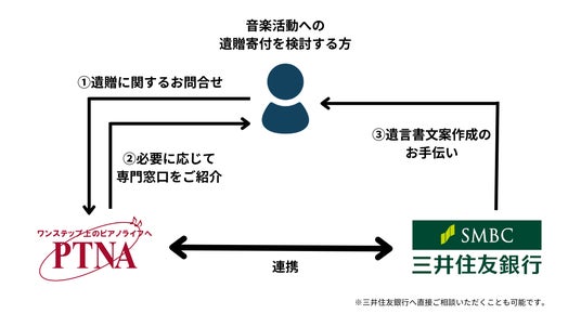 法的効力のある遺言書を正確に作成するには専門的な知識が必要となるため、寄付を受ける団体と専門家・専門機関との連携が重要になります。今後、遺贈寄付を検討する方がピティナにご相談いただいた際には、内容に応じて三井住友銀行の専門窓口にお繋ぎし、より安心して遺言書に寄付の意志を遺していただくことができるようになります。