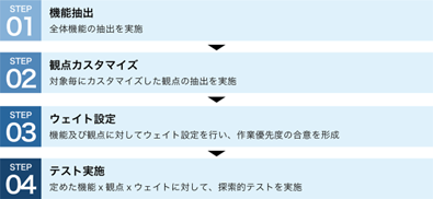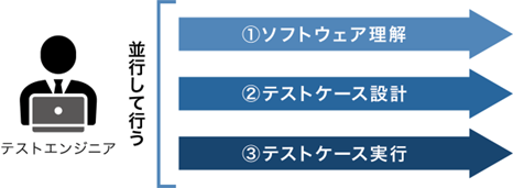 「AGEST式探索的テスト」では、以下の1.~3.のすべてを「並行」して実施します。重要な工程となる1.と2.については、経験豊富な当社テストエンジニアが、案件それぞれの開発内容や製品仕様を考慮して対応いたします。