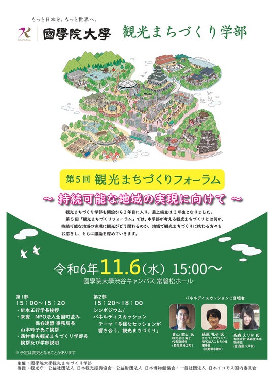 國學院大學(東京都渋谷区、学長:針本正行 、以下本学)観光まちづくり学部は、11月6日(水)に、第5回 観光まちづくりフォーラム ~持続可能な地域の実現に向けて~を本学の渋谷キャンパスにて開催します。