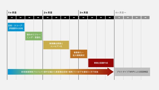 新規事業開発プロジェクトの要件定義から事業機会探索~戦略づくりまで最短3ヶ月で実施し、事業企画としての論理的な確信をつくったうえで、プロトタイプ・MVP(実用最低限の製品)による仮説検証フェーズに移行することができます。