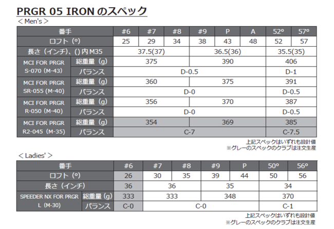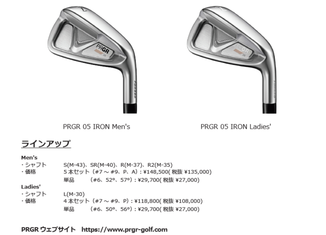(株)プロギアは、構えやすさ、打感、飛距離性能、コントロール性、やさしさといったアイアンに求められる性能を追求した「PRGR IRONs(プロギア・アイアン)」から、ヘッドスピード40m/s前後のゴルファーが最もやさしく飛ばせる「PRGR 05 IRON(ゼロゴ・アイアン)」を5月中旬から発売します。なお、同様のコンセプトで女性の平均的なヘッドスピードである30m/s前後のゴルファー向けに専用設計したレディースモデルもラインアップします。
