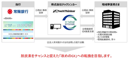株式会社めぶきフィナンシャルグループの常陽銀行(頭取 秋野 哲也)は、GX関連スタートアップである株式会社テックシンカー(代表取締役 洪 偉豪)と連携し、同社が運営する、地域密着型GXプラットフォーム「エコのば」を地域事業者に紹介する取り組みを7月25日より開始しますので、お知らせいたします。