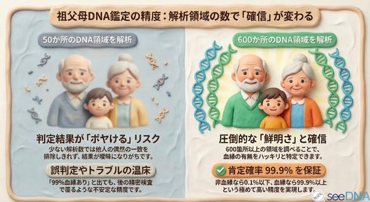 国内でも、次世代技術による祖父母DNA鑑定を実施している機関があります。seeDNA遺伝医療研究所では、2026年3月18日から最先端の次世代解析技術を使った祖父母DNA鑑定のサービスを開始しました。生物学的な祖父母ではない場合は肯定確率0.1%以下、祖父母である場合は肯定確率99.9%以上を保証できるようになりました。