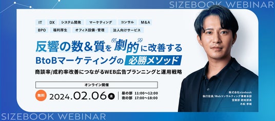 株式会社sizebook(本社:東京都港区、代表取締役:寺本光宏)は、2025年2月6日(木)の11:00~12:00および17:00~18:00に、ウェビナー『反響の数&質を劇的に改善する BtoBマーケティングの必勝メソッド』を開催いたします。