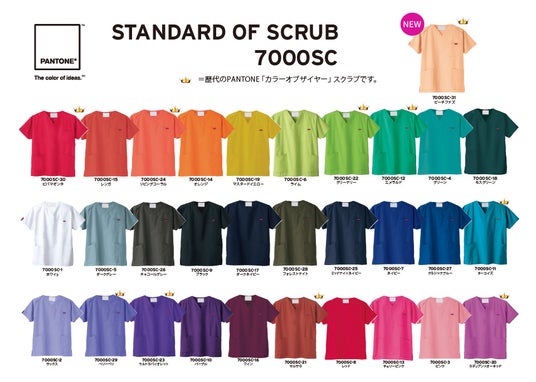 PANTONEシリーズは本年で15年目、カラー・オブ・ザ・イヤーでは11年目を迎えます。7000SC以外にも、スクラブでは複数のデザインバリエーション、パンツを展開しています。シリーズ全体で白衣業界最多44色を展開し、累計330万枚販売の大ベストセラーです。(2023年12月時点)