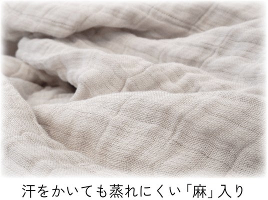 直接肌が触れる表裏の生地は綿と麻を織り込んだガーゼ生地で作られており、汗や熱をサラっと逃がす優れた通気性と吸湿性が特徴です。綿100%生地よりもさらに通気性が高く、こもりがちな汗や湿気を素早く吸収し発散、暑い夏も快適にお使いいただけます。