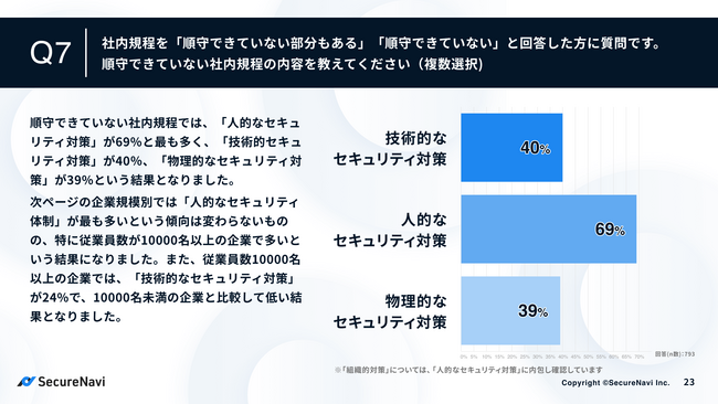 この結果は、私自身が今まで数多くの企業の情報セキュリティ体制を目にしてきた中で感じる直感とも一致します。多くの企業は、複雑かつ日々進化する最新のセキュリティ対策をカバーするため、重厚な社内規程を作成します。その一方で、重厚になればなるほど、すべてを見通すことが難しく、また、現場の実務と乖離した表現が増え、社員がそれらの社内規程から目をそらしてしまうという状況に繋がってしまいます。