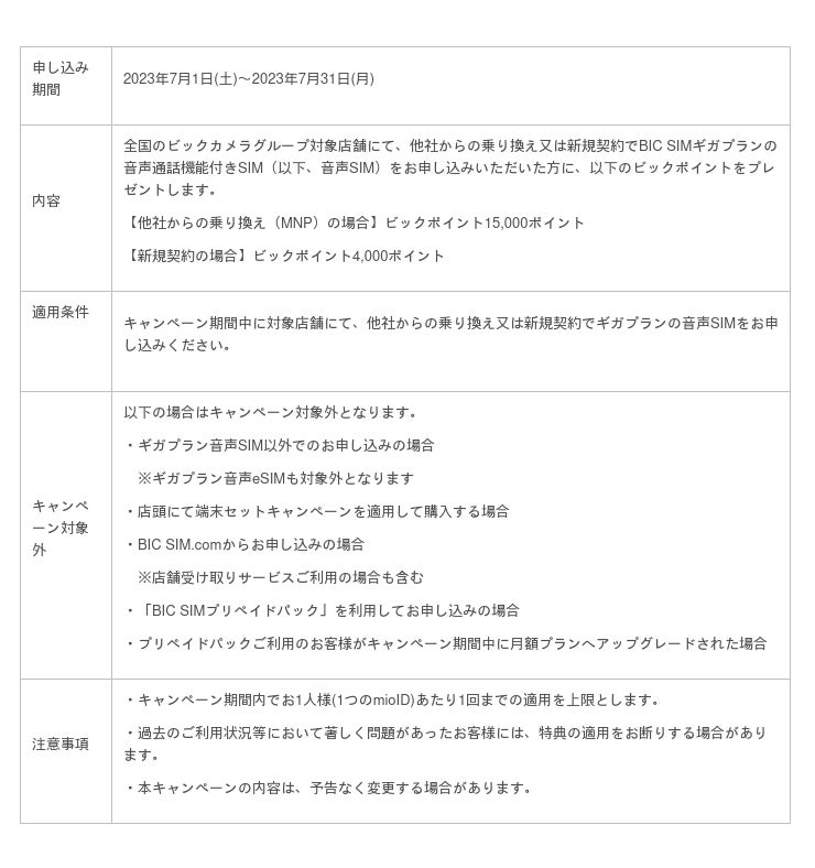 ビックカメラグループの格安SIMである「BIC SIM powered by IIJ」は、全国のビックカメラグループ対象店舗にてお申し込みの方限定でビックポイントを最大15,000ポイントプレゼントするお得なキャンペーンを実施します。