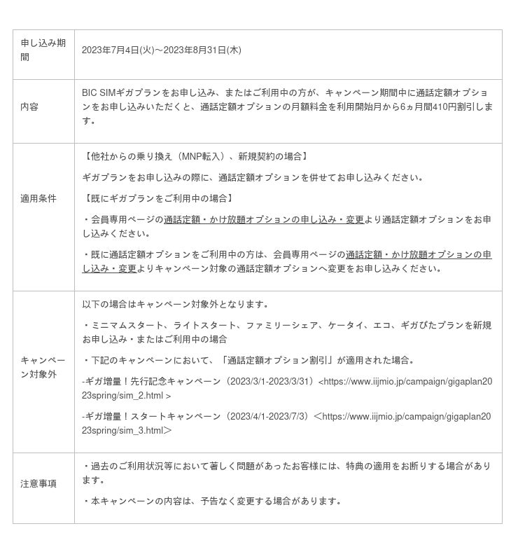 通話定額オプションの月額料金を利用開始月から6ヵ月間、毎月410円割り引くキャンペーンを実施します。