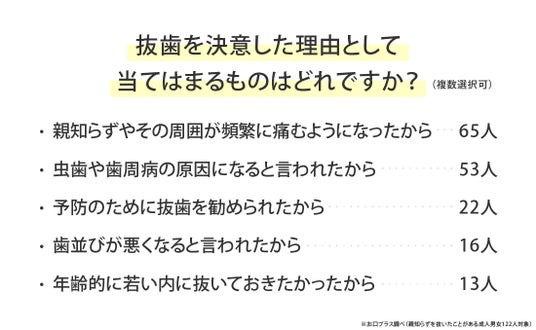 - 抜歯の決意理由は「頻繁な痛み」(65人)が最多で、「虫歯や歯周病の原因になる」(53人)が続きました(複数選択可)。