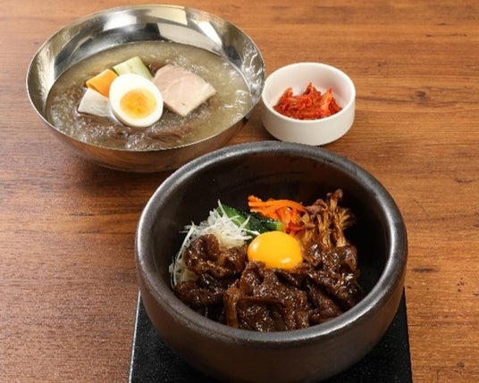 1. 和牛リブロースの月見石焼ピビンバとミニ 冷麺セット ¥2,080(税込み)