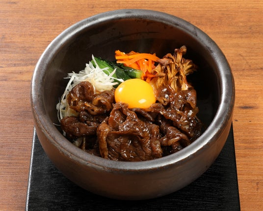 「和牛リブロース月見石焼ピビンバ」は贅沢な国産和牛のリブロースを甘辛く味付け。そこにお月様に見立てた卵黄をトッピングいたしました!