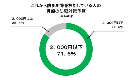 現在、防犯対策をしている人の費用の平均は、月額3,833円でした。一方で、今後、防犯対策を検討する人の予算は、7割が月額2,000円以下であることが判明しました。