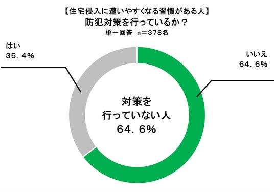 住宅侵入のリスクがある住宅の特徴※1に当てはまる家庭を調査したところ、「はい」と回答した人は 75.6%となりました。そのうち、64.6%が防犯対策を行っておらず、防犯対策ができている人を上回りました。多くの人が無意識のうちに、住宅に侵入されやすい状況を作り出していることが分かりました。