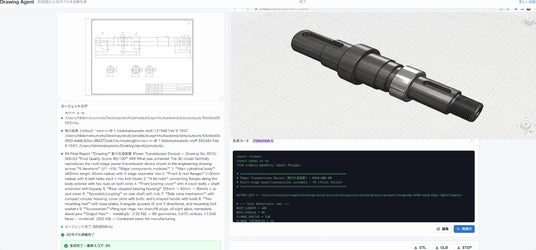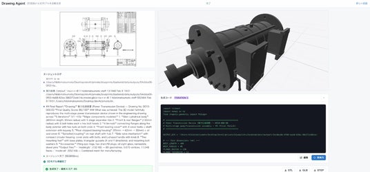 生成過程はブラウザ上でリアルタイムに確認できます。AIが図面をどう解釈し、モデルをどう構築し ているかを逐次表示するため、処理がブラックボックスになりません。元の図面と照合して品質スコ アが基準値に達するまで自動で修正を繰り返し、⼨法的に正確な仕上がりを担保します。