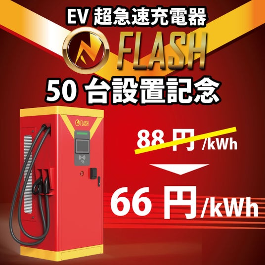 株式会社テンフィールズファクトリー株式会社(京都府相楽郡精華町光台1-7 けいはんなプラザ9F CEO:市川 裕)は、EV急速充電器「FLASH」の日本国内設置台数が50台に到達したことをお知らせいたします。これを記念して、2024年7月15日から充電単価をこれまで88円/kWhから値下げした66円/kWhで充電が可能となります。