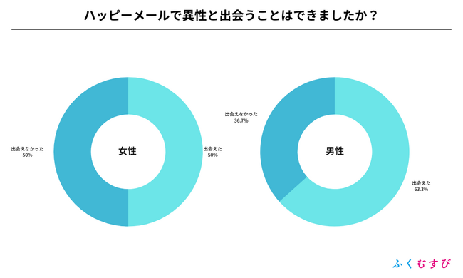 ・ハッピーメールで異性と出会えた割合は、男性が63.3%、女性が50%となりました。