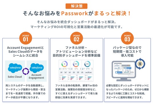 従来、Account EngagementのデータをTableauで統合分析するには、DWH(データウェアハウス)の構築など大掛かりなシステム投資が必要でした。本パッケージは、Praztoが開発・提供するデータ連携サービス「Passwork(Any2Tab)」を活用することで、これらの課題をシンプルかつ低コストに解決します。