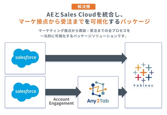 「MA~CRM Tableau統合ダッシュボード導入パッケージ」は、Account EngagementとSalesforce Sales CloudのデータをTableauに自動連携し、マーケティング接点から商談・受注までの全プロセスを一元的に可視化するパッケージソリューションです。