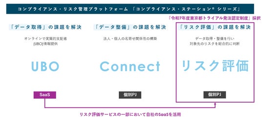 当社が提供するコンプライアンス・データ管理プラットフォーム「コンプライアンス・ステーション(R)シリーズ」は、データ収集(UBO)、データ整備(Connect)、リスク評価の3サービスから構成されています。