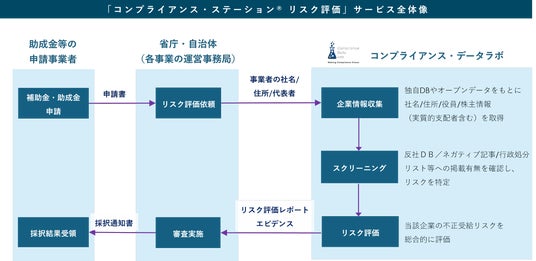 「コンプライアンス・ステーション(R)リスク評価」は、事業の運営事務局に代わり、補助金・助成金申請事業社に対して複数の観点からリスクを総合的に評価し、適切な事業者採択の意思決定をサポートします。なお、リスク評価代行作業の一部(当該企業の実質的支配者の特定)においては弊社の別サービス「コンプライアンス・ステーション(R)UBO」を活用しています。