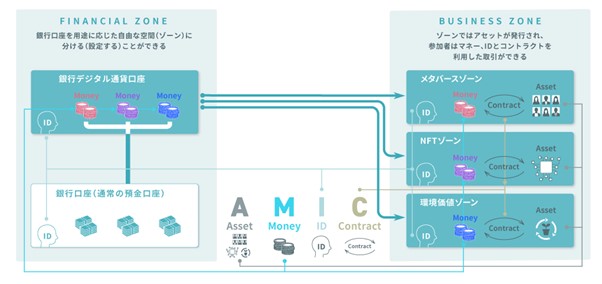 デジタル通貨を管理するDCJPYネットワークは、発行銀行が参加するフィナンシャルゾーン(共通領域)と事業会社がビジネス展開するビジネスゾーン(付加領域)で構成され相互接続によりトランザクションが連動します。