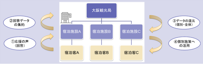 -アンケート内容も各ホテルの満足度ではなく、大阪への観光・宿泊に特化したものにすることで、宿泊施設は宿泊客の動向やニーズに応じた施策の検討が可能となります。
