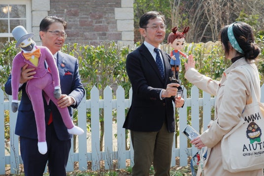 「魔女の家」前で来園者を出迎える宮崎吾朗監督(左から2人目)、大村秀章知事(左から1人目)。宮崎監督はアーヤの人形を操りながらグリーティングに参加しました。