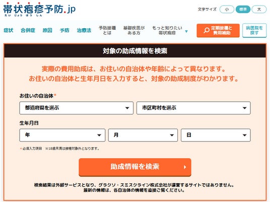 ・疾患情報サイト「帯状疱疹予防.jp」から、帯状疱疹ワクチンの定期接種と自治体からの費用補助の情報が検索可能