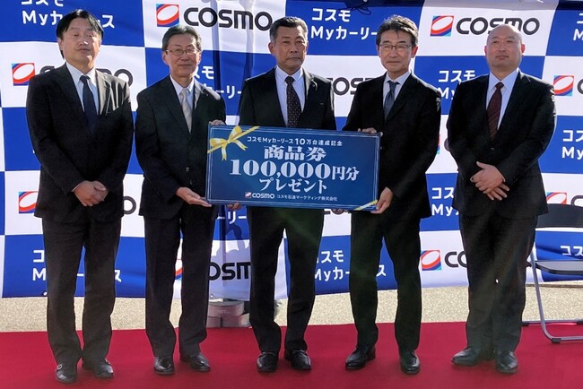 コスモ石油マーケティング株式会社(代表取締役社長:森山 幸二、以下「当社」)では、2011年4月から本格的に展開しておりますコスモMyカーリースの累計契約台数が、この度、10万台を突破しました。これを記念し、10万台目にご契約をいただいたお客様をお迎えし、セレモニーを執り行いました。