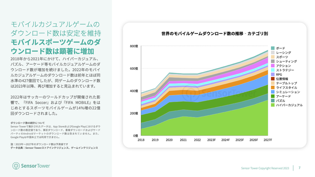 2022年はサッカーのワールドカップが開催された影響で、『FIFA Soccer』および『FIFA MOBILE』をはじめとするモバイルスポーツゲームが14%増の22億回ダウンロードされました。2022年のハイパーカジュアル、パズル、アーケード等のモバイルカジュアルゲームのダウンロード数は前年の水準を維持し、2023年は再び増加すると見込まれています。
