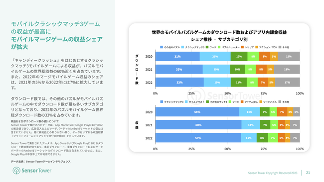 2022年モバイルマージゲームの収益は25%近く増加し、収益シェアは2021年から5%拡大して7%となっています。『キャンディークラッシュ』をはじめとするモバイルクラシックマッチ3ゲームによる収益が、モバイルパズルゲームの世界総収益の60%近くを占めています。モバイルパズルゲームにおいてダウンロード数が最も多いサブカテゴリは、その他のパズルです。