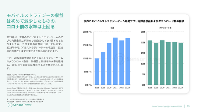 2022年は、世界のモバイルストラテジーゲームのアプリ内課金収益が初めて6%減少して167億ドルとなりましたが、コロナ前の水準は上回っており、2023年には回復すると見込まれています。2022年の世界のモバイルストラテジーゲームダウンロード数は2021年の水準を維持しており、2023年も安定的に推移すると予想されています。