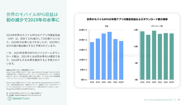 2022年は、世界のモバイルRPGのアプリ内課金収益が初めて15%減少して2019年の水準に近づきましたが、2023年はその減少幅が縮小すると予想されています。一方、2022年の世界のモバイルRPGダウンロード数は14億回で、2021年と同程度の水準を保っています。