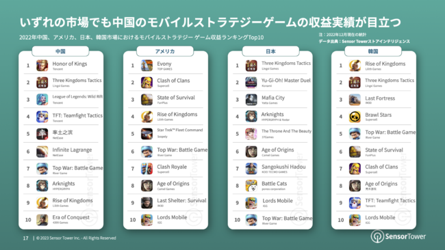 中国のモバイルストラテジーゲームは、アメリカ、日本、韓国等の主要海外市場において際立った収益を上げています。中でも『Rise of Kingdoms ―万国覚醒―』『トップウォー』『Age of Origins』『ラストシェルター』『ロードモバイル』等モバイル4Xストラテジーゲームが2022年のアメリカのモバイルストラテジーゲーム収益ランキングでトップ10にランクインしています。