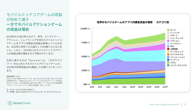2022年は、RPG、ストラテジー、アクション、シューティング等のモバイルミッドコアゲームのアプリ内課金収益が初めて11%減少して463億ドルとなりましたが、2023年は再び増加に転じると予想されています。『Survivor!.io』をはじめとするアクションモバイルゲームは、2022年世界収益が45億ドルとなり、9%増加しています。