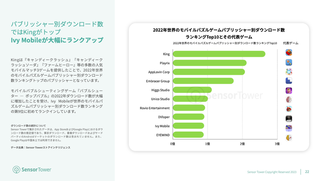 モバイルバブルシューティングゲーム『バブルシューター - ポップバブル』のダウンロード数が大幅に増加したことを受け、競争が激しいパズルゲーム市場においてIvy Mobileが頭角を現し、2022年のパズルモバイルゲームパブリッシャー別世界ダウンロード数ランキングで初めて第9位にランクインしています。