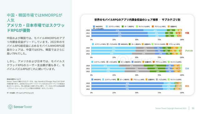 モバイルRPGのサブカテゴリの人気度は、市場ごとに違いが見られます。中国および韓国市場においては、モバイルMMORPGがアプリ内課金収益の面でリードしていますが、アメリカおよび日本市場においては、モバイルスクワッドRPGのユーザー支出額が最も多くなっています。