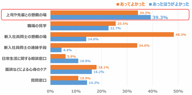 「新入社員研修中の所属会社からのサポートで、あったほうがよかったことはありますか」という設問に対しては「上司や先輩との懇親の場」という回答が最多(39.3%)であり、研修中から、配属後の上司や先輩社員との懇親の場を求めているという傾向が見られました。