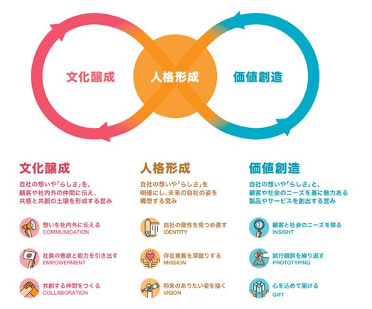 本事業に参加した3事業者が発表するのは、単なる見た目のデザインではなく、「人格形成」を軸に「文化醸成」と「価値創造」について、伴走支援者であるデザイン経営専門家との”対話”によって、行き来させながら取り組んだ内容です。