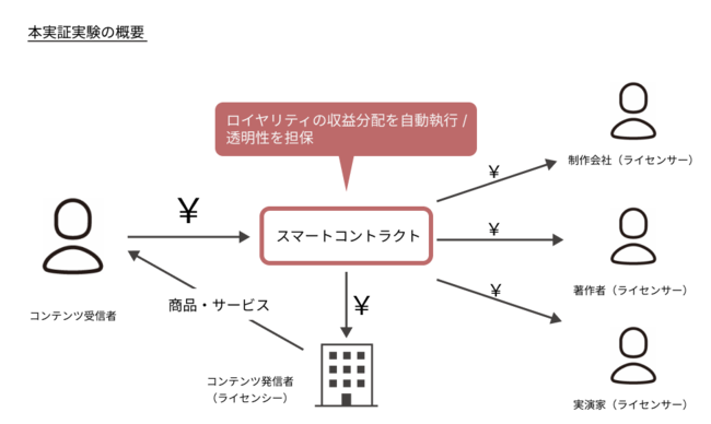 本実証実験は、ブロックチェーンを活用することで、これらのライセンス契約の課題を解決していくものであり、コンテンツビジネスにおける効率化とブロックチェーン技術の社会実装を進めていくものです。