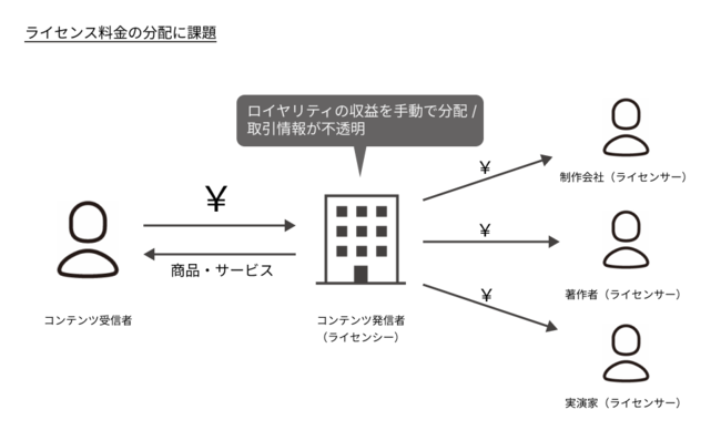 一方で、コンテンツを利用する際に発生するライセンス契約には、煩雑な手続きや利用時に発生するステークホルダーへの収益分配などが大きなコストとなり、課題となっています。