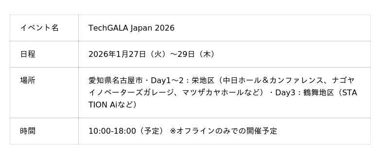 2026年1月27日(火)から29日(木)にかけて開催される「TechGALA Japan 2026」での注目のセッションやプログラムに参加する企業を紹介します。