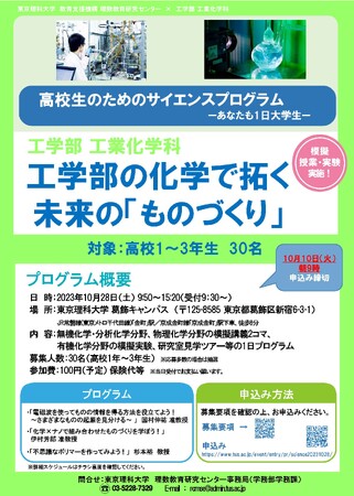 東京理科大学理数教育研究センターでは、葛飾キャンパス(東京都葛飾区)にて10月28日(土)に高校生に大学の教育・研究の一部を体感してもらうプログラムを開催します。ぜひご参加ください