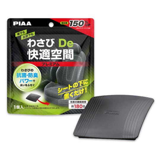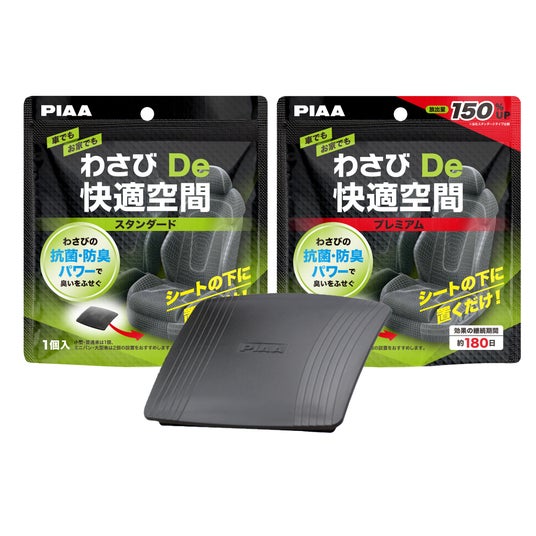 PIAA(ピア)株式会社(本社:東京都文京区、代表取締役社長:寺田 浩康)は、車のシート下に置く抗菌・防臭剤『わさび De 快適空間』(読み:ワサビデカイテキクウカン)を、スタンダードタイプ・プレミアムタイプそれぞれ1個入りをお求めやすくアルミ袋仕様に変更して発売いたします。2025年3月発売です。