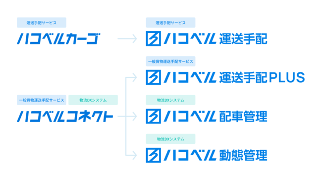 運送手配サービス領域において、軽貨物手配サービスを「ハコベル運送手配」、一般貨物手配サービスを「ハコベル運送手配PLUS」と名称変更いたします。また、物流DXシステム領域において、これまで「ハコベルコネクト」として提供してきたサービスを「ハコベル配車管理」「ハコベル動態管理」など機能別に名称を分けて、ニーズにお応えしてまいります。