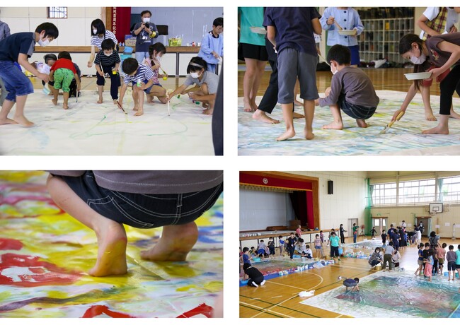 児童が、皆で裸足になって体育館いっぱいに大きな絵を描きました。