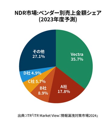 ハイブリッドおよびマルチクラウド企業向けのAI主導型サイバー脅威検知・対応のパイオニアであるVectra AI(本社:カリフォルニア州サンノゼ、CEO:ヒテッシュ・セス)の日本法人、Vectra AI Japan(所在地:東京都千代田区 ジャパン・カントリー・リード:佐々木 元威)は、日本の独立系ITコンサルティング・調査会社、株式会社アイ・ティ・アールが2024年6月に発行した、市場調査レポート「ITR Market View:情報漏洩対策市場2024」のNDR市場で、国内NDR市場シェアが35.7%(2023年度予測)となりました。また、Vectra AI Japanが同調査の対象になった2020年以来、4年連続で売り上げ、シェアともに1位を達成しました。(数字はITRによる推定値)
